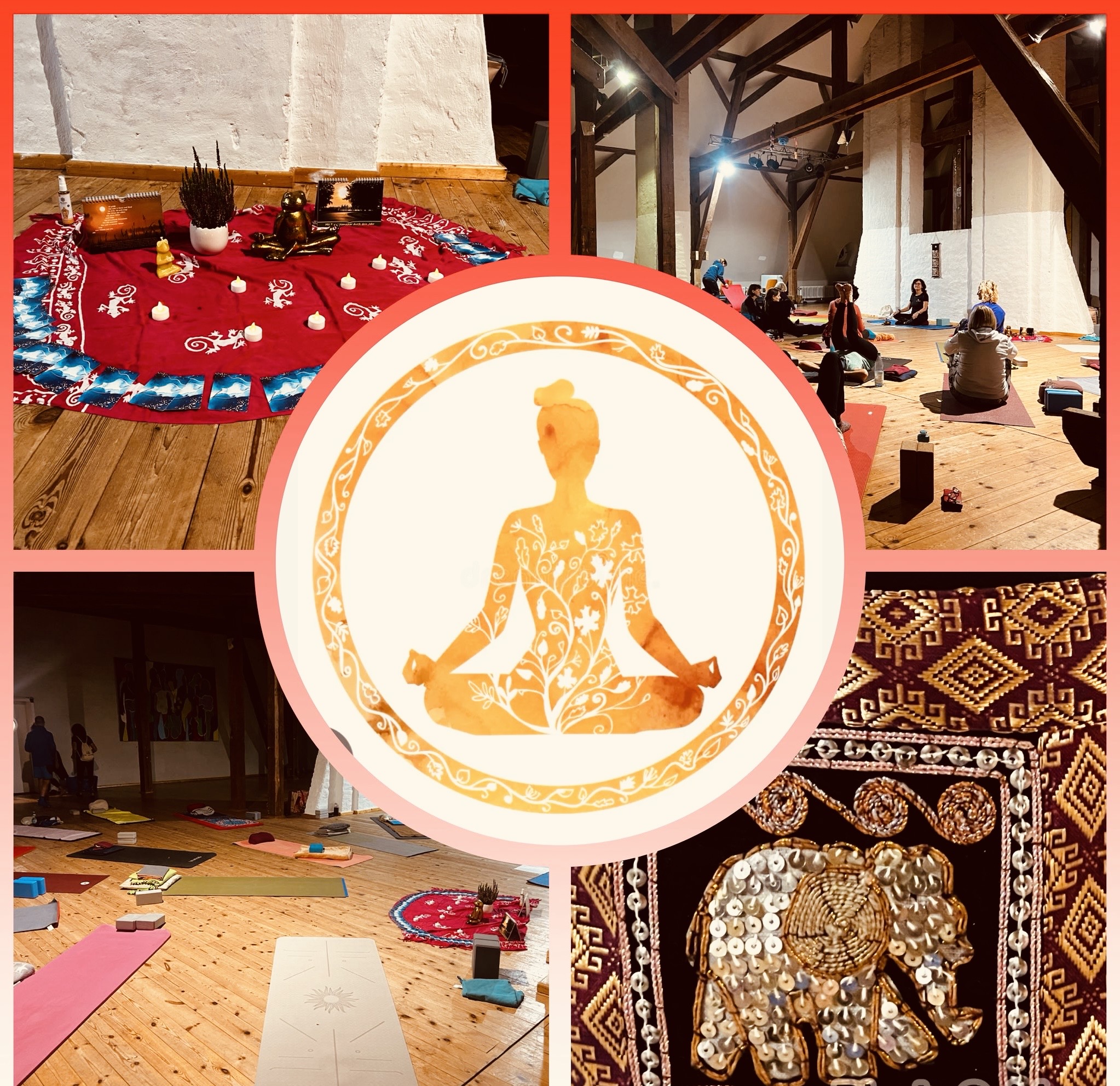 Tolles Herbstwetter empfing uns am Freitagabend und einige zog es gleich hinaus in den schönen Park um das Schloß herum. Dann hieß es viele Treppen zu steigen zum Theaterboden im Dachgeschoß, wo unsere Yogaeinheiten stattfanden. Was für ein Raum, welch´ großartiger Klang des ersten OM, wir konnten sofort abschalten, den Alltag außen vor lassen und einfach Sein.